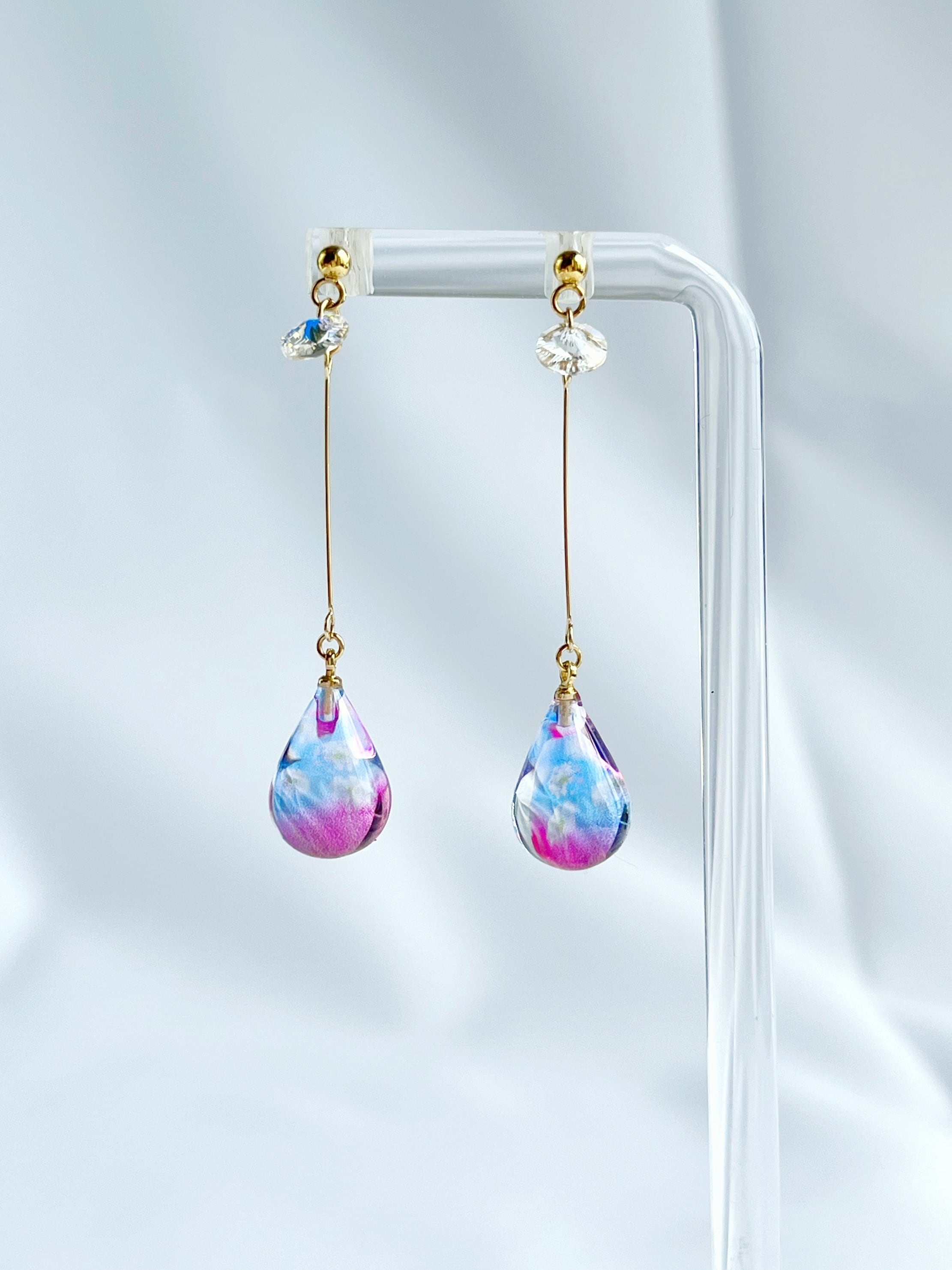 レースフラワーの色合いを活かし、シンプルでありながら思わず目を引く上品なデザインに仕立てました。使用している素材は非常に軽量で、長時間の着用でも快適です。小さなクリスタルガラスで一点のアクセントを加えています。 しずくの中には透き通った写真が収められており、特殊な透明フィルムにプリントされています。つけると自然に溶け込むように見え、肌や周囲との調和が楽しめます。