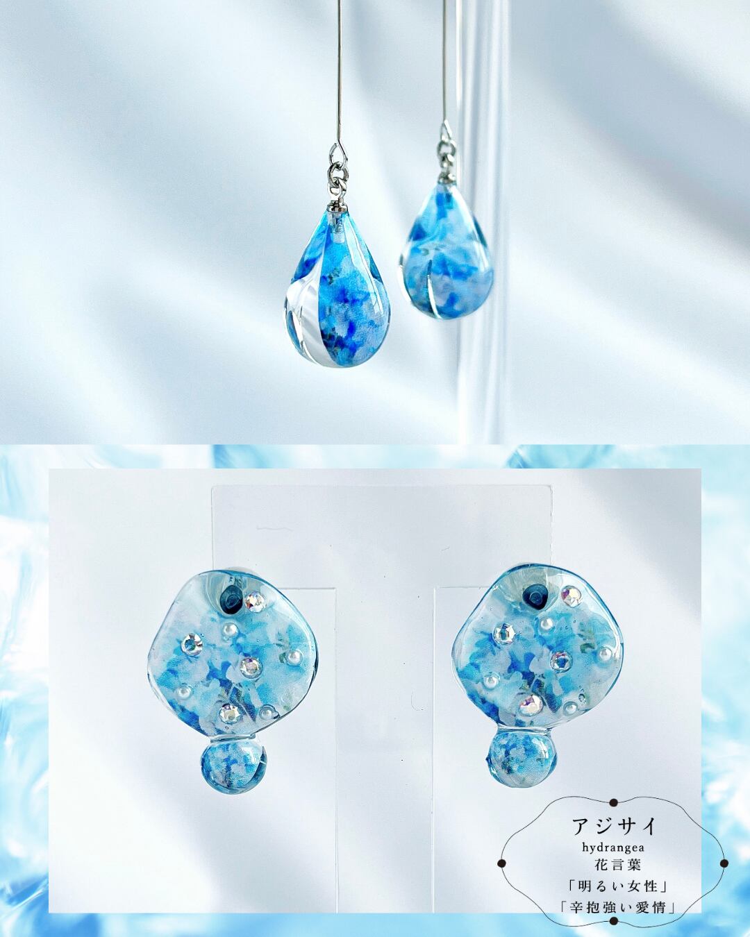 ◌ 儚げに咲くあじさいの写真をレジンで閉じこめた耳飾りです。