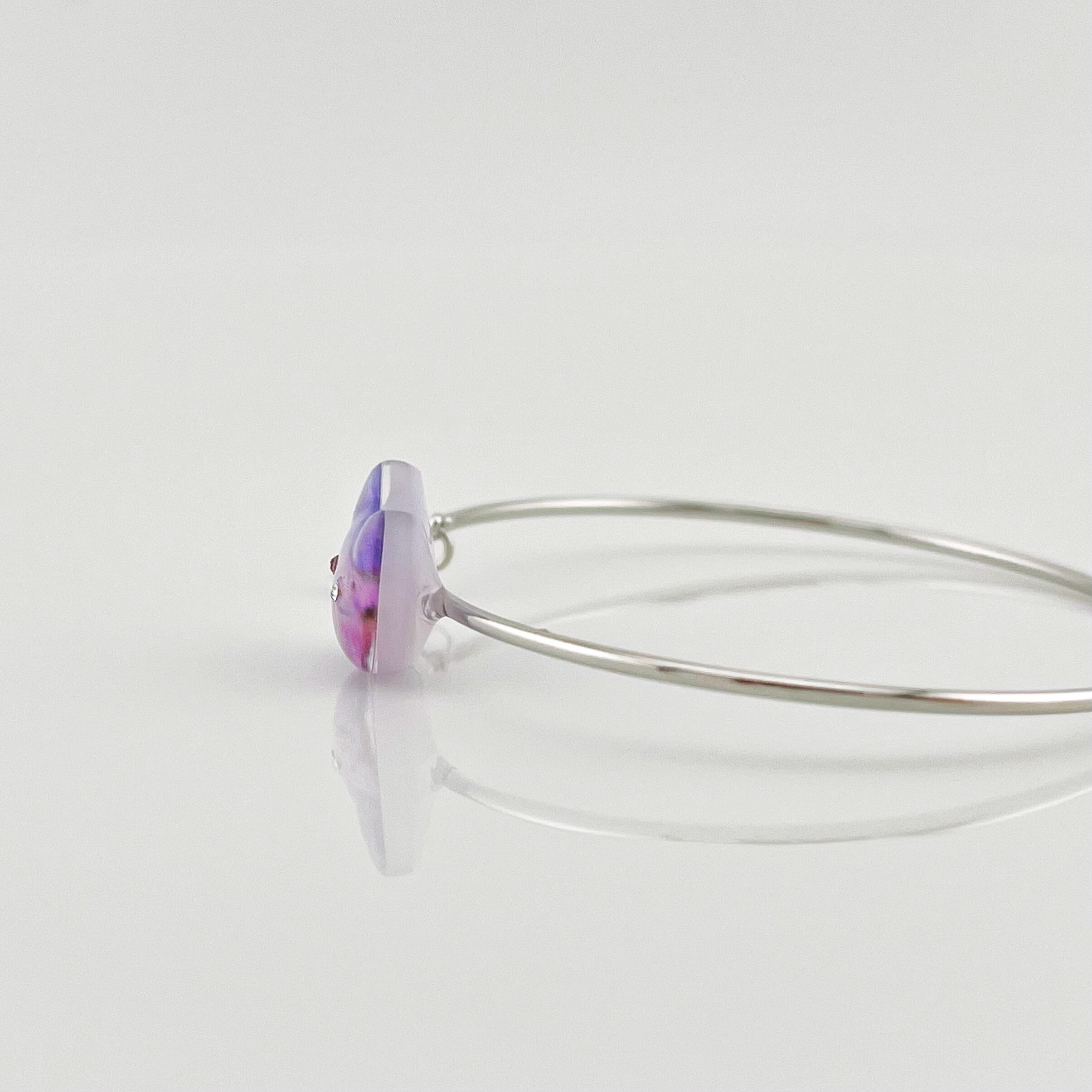 形状記憶ワイヤーのバングル。細身のワイヤーバングル金具にレースフラワーの写真を閉じ込めた猫ちゃんパーツを飾りつけ、大人可愛いバングルに仕上げました。
