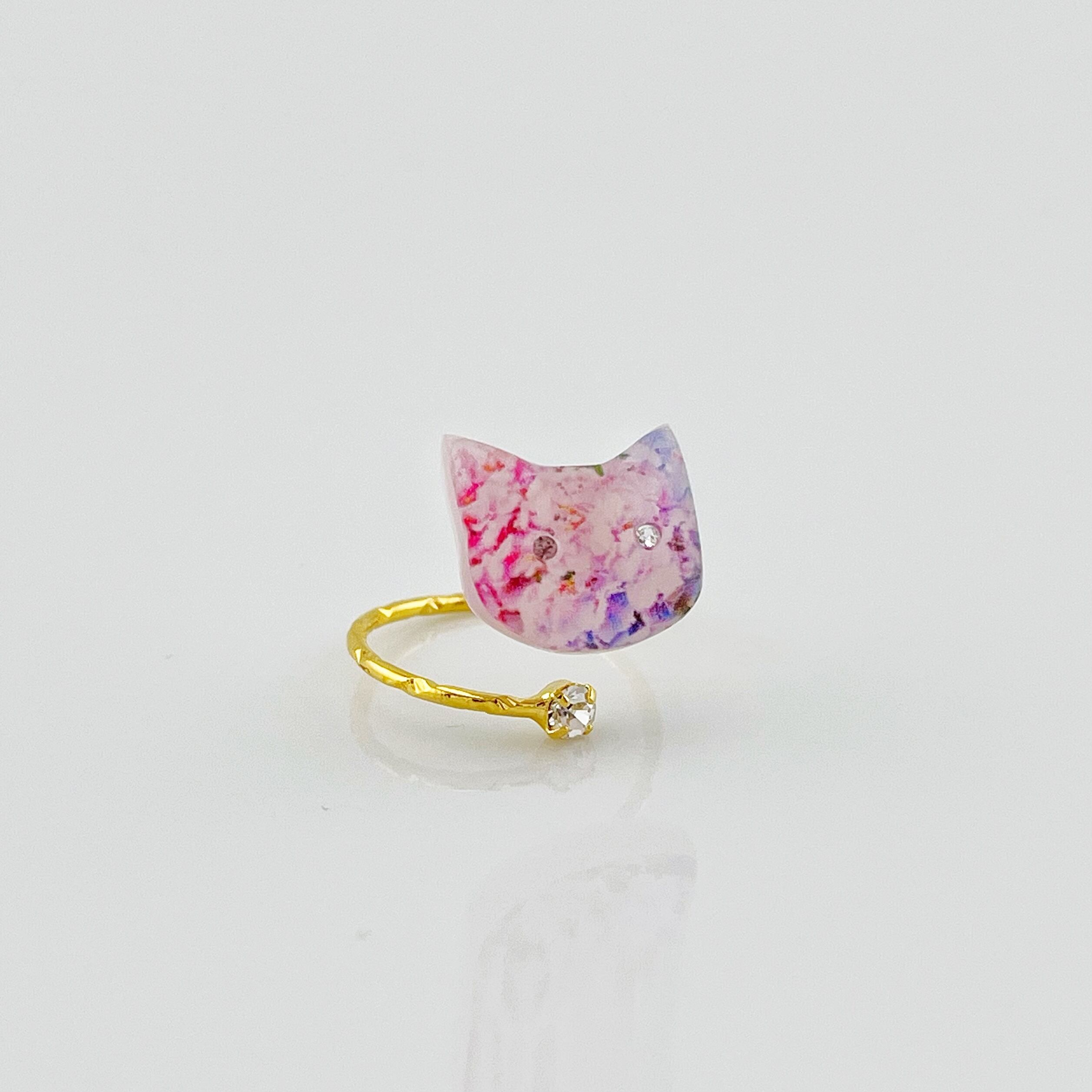 作家自身が撮影したアジサイの写真を猫ちゃんのカタチのなかにとじこめたリングです。