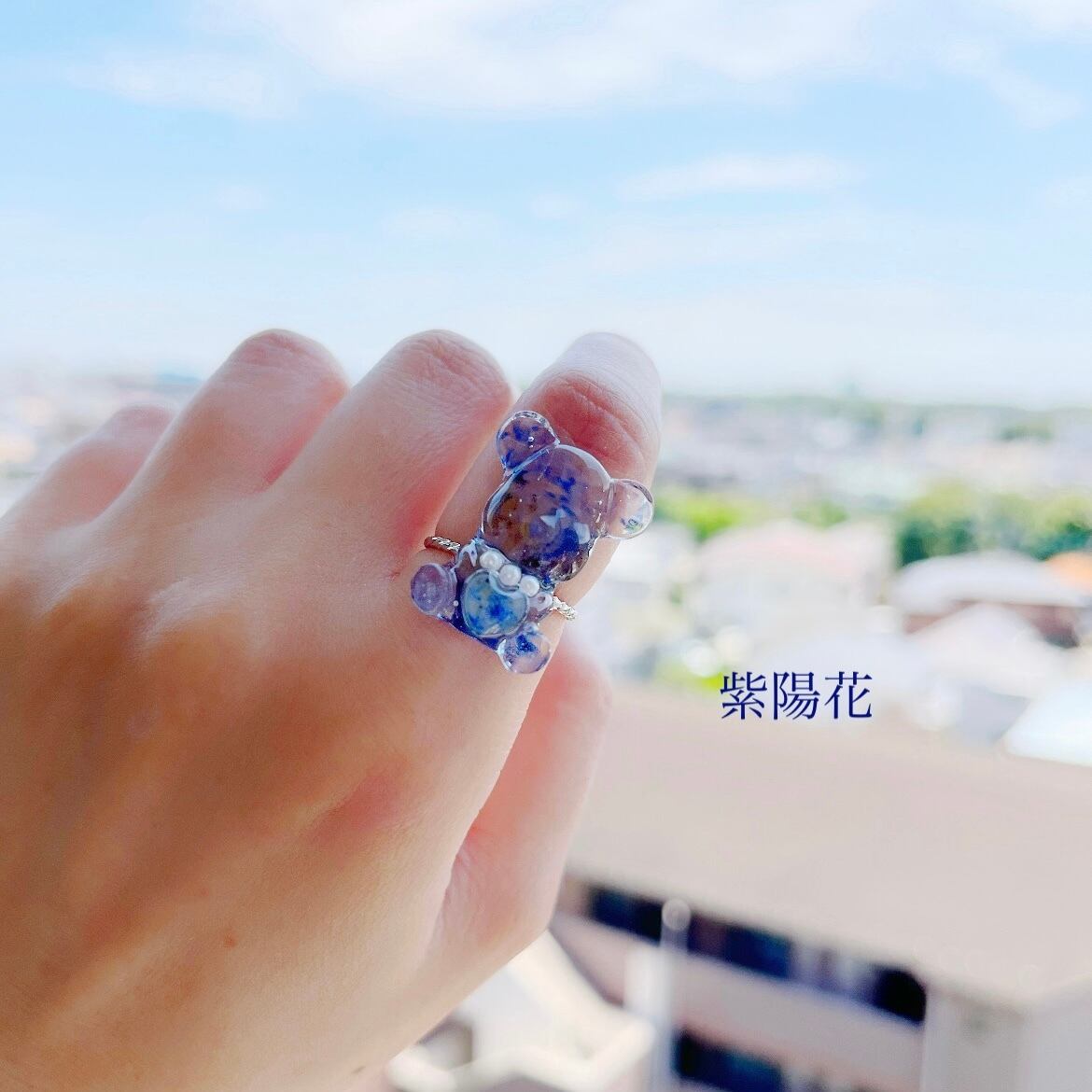 クリアなお花の写真を閉じこめたくまちゃんが花束に見立てたハートを抱えて愛を伝えている、そんなシチュエーションをイメージしながら制作しましました。ハートの花束は太陽の光、紫外線でカラーチェンジする遊び心のあるリングとなっております。