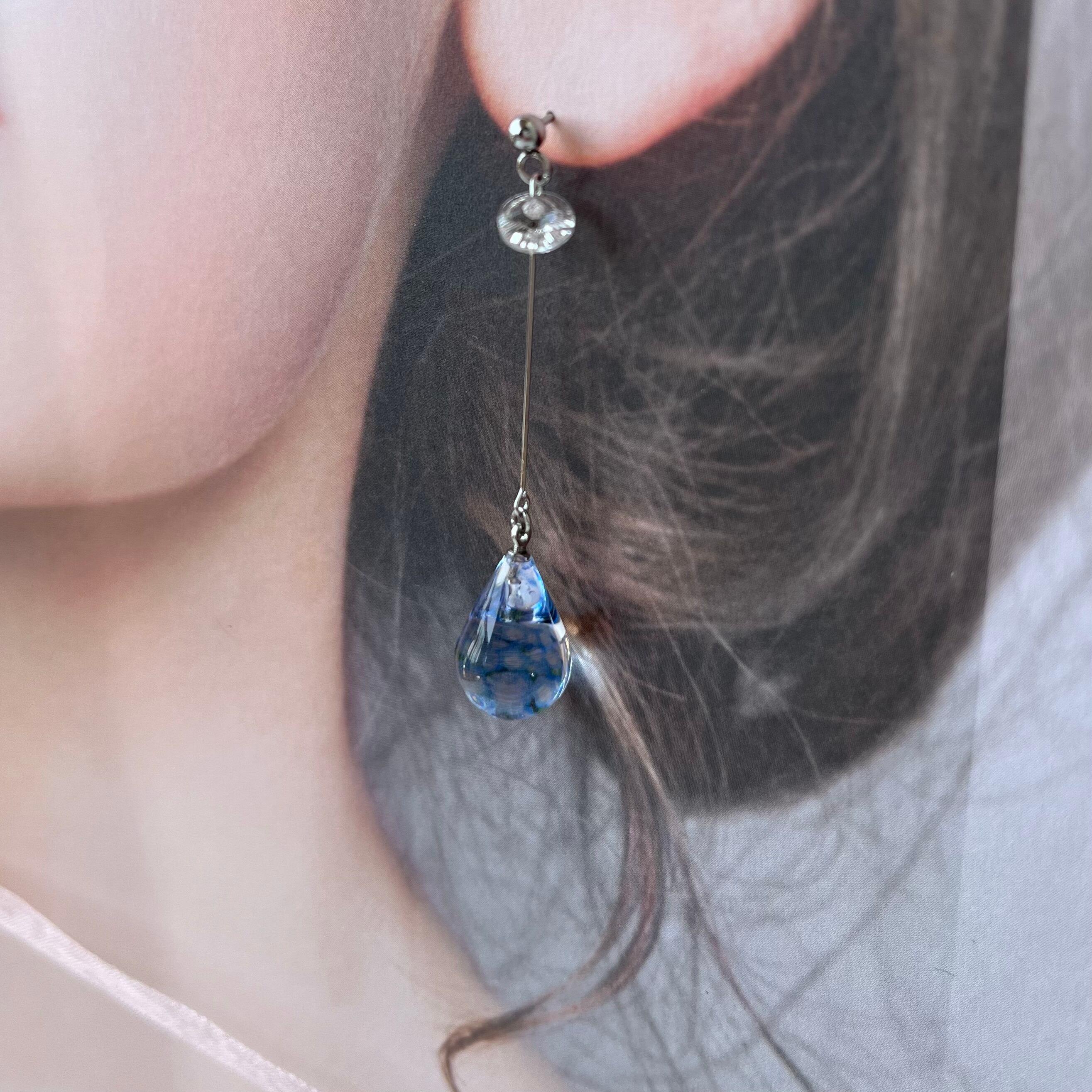 きゅるんとしたしずくのなかに閉じ込められているのは、クリアで透明なカスミソウの写真です。特殊な透明フィルムに写真をプリントし制作しています。着けると重なった肌や風景にクリアな写真は溶け込み、ほんのりと発色します。